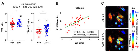 The C99 720-670 biosensor is compatible with the C99 Y-T biosensor. (A) The C99 720-670 biosensor was co-transfected with the C99 Y-T biosensor into CHO cells, followed by the treatment with 1 µM DAPT or vehicle control. The cells were excited with 405 and 640 nm lasers, and the emissions of 470, 530, 670 and 710 nm (±10 nm) were measured. The emission of 530 over 470 nm (Y/T ratio) and 710 over 670 nm (720/670 ratio) were significantly increased by DAPT treatment compared to vehicle control. The acceptor over donor emission ratio in cells treated with DAPT is divided by that in corresponding vehicle-treated cells, and the fold change compared with the C99 Y-T biosensor is shown (the vehicle condition set as 1). n = 30 cells; mean ± SD; * p < 0.05, ** p < 0.01, Mann–Whitney U test. (B) Scatter plots represent the Y/T ratio and 720/670 ratio in the same cells in vehicle treated condition (corresponding to the Figure 3A). The 720/670 ratio is correlated with the Y/T ratio. Y = 0.5413X − 0.0503, R2 = 0.4008, *** p < 0.001, Pearson correlation coefficient. (C) The pseudo-colored images of the Y/T ratio (top panel) and 720/670 ratio (bottom) in the same cells. Scale bar, 50 um.