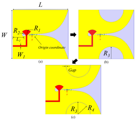 The primary modified structure of the Vivaldi antenna is shown in Figure 1b. Similar to the corrugated Vivaldi antenna [5], semicircular slots are applied for the edge of the proposed antenna for miniaturization and improving radiation performance. To excite λ/2 spaced two electric dipoles, the proposed embedded semicircular patch elements were optimized to have the electric fields act in opposite directions at both ends of the antenna. This can reinforce gain to the end-fire direction for the λ/2 spaced two effective dipoles aligned in an opposite direction against each other. Although a well known slotted Vivaldi antenna works for expanding impedance matching toward lower band, it has a critical limit in realizing the simultaneous gain enhancement in the entire frequency bands. Therefore, a new design methodology that can utilize the whole structure of the slotted Vivaldi antenna dimension further efficiently by modifying ground shape, was devised. As shown in Figure 1c, a simple topology of the proposed SPEVA having the embedded semicircular patch elements can achieve the aforementioned low-band radiation features without increasing the entire antenna dimension.