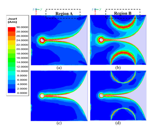 Figure 2 shows field distributions of the electric surface current of the conventional Vivaldi antenna and SPEVA at 3 and 7 GHz. By comparing the field distributions in the frequencies of 3 and 7 GHz, it was pre-examined that the SPEVA structure has a significant effect on low-frequency operation, but not much on the other frequencies. In Figure 2a, the electric surface current at the side edge of the antenna is dominant along region A, which is a common feature in the conventional miniaturized Vivaldi antenna having a finite ground plane. By using semicircular patch embedment, the field distributions are changed to minimize the surface currents that contribute to unnecessary radiation in the –x axis direction as shown in region B of Figure 2b. The excited surface currents in the slots between the ground of the Vivaldi antenna and the embedded semicircular patch generates possibilities in designing radiating fields along the side edge of the proposed SPEVA. On the other hand, reduced electric surface currents in Figure 2c,d indicate that the SPEVA structure does not degrade efficient radiation at high frequencies.