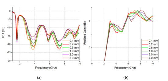 Simulated (a) S11 and (b) realized gain of SPEVA with the different value of Gap.