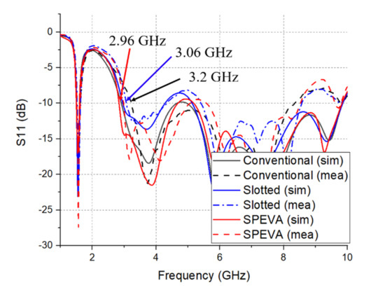 The effect of the Gap parameter on the reflection coefficient and realization gain of the proposed SPEVA is simulated and studied in Figure 5. It can be observed that the interaction between the semicircular patch and the antenna increases as the gap of the semicircular patch decreases. As the gap decreases, the bandwidth becomes wider and the gain of the low-band boundary increases. Then, exceeding a certain point will degrade performance. The optimized point is 0.2 mm. Figure 6 shows variation features in S11 of the conventional Vivaldi antenna, semicircular slotted Vivaldi antenna and SPEVA, respectively. The 10-dB return loss bandwidth of the conventional Vivaldi antenna starts from 3.2 GHz, while the slotted Vivaldi antenna lowers it to 3.06 GHz. It should be noted that although the slotted Vivaldi antenna can be miniaturized, the bandwidth is decreased. The SPEVA lowers the limitation down to 2.96 GHz leading to antenna miniaturization.