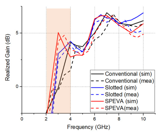 The measured results agree well with the simulated results except for slight frequency shifts due to unstable soldering and attachment of the SMA connector. The proposed SPEVA has an ultrawide band of 2.96–5.05/5.58–8.52 GHz. Figure 7 shows simulated and measured results of the gain variations in the conventional Vivaldi antenna and SPEVA depending on the operating frequency.