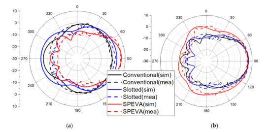 The gain of the conventional Vivaldi antenna is about 0 dBi at 3 GHz, while the gain of SPEVA is about 5 dBi. Simulated and measured results just show a difference of about 1 dB. Figure 8 shows the simulated and measured radiation patterns of the conventional slotted Vivaldi antenna and SPEVA at 3 and 7 GHz. The main lobes of the radiation patterns head to the end-fire direction as expected. Compared to conventional or slotted Vivaldi antennas, SPEVA achieves a significant gain improvement in the low frequency band. This maintains the performance in the high frequency band, solves the gain deterioration in the low frequency band of the UWB antenna mentioned above, and reduces the gain difference between the frequencies. There is a 1 dB reduction in the 4 GHz band, but the performance at 3 GHz has a significant gain improvement of 5 dB.