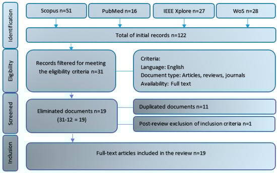 Figure 1 presents the systematic process for the selection of peer-reviewed articles, in which it was identified that a total of 122 documents, published between 2015 and June 2020 and which included the search terms, were found on the databases. In essence, they are studies that focused on the support of upper limb physical rehabilitation, with the use of videogames and motion capture systems. From the total, after applying the eligibility criteria described, 31 works were left; afterward, 11 were eliminated as they were duplicated, and one referred to a book of abstracts from a conference []. Thus, the number was reduced to 19 documents, which were directly related to the topic of this review.