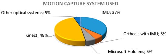 Regarding the motion capture systems reported to be used in the 19 studies, nine (48%) used Microsoft Kinect, seven (37%) used inertial measurement units (IMUs), one (5%) used a passive orthosis (which integrates inertial sensors, which would add up to 42% for the use of inertial sensors in these works), one (5%) of the studies used Microsoft HoloLens, and the remaining 5% corresponded to a study which reported a systematic review in a period different from that established and, therefore, it was not considered in the review (see Figure 2).