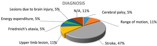 In the studies analyzed, it was identified that 47% of the investigations focused on the treatment of people who suffered a stroke, 11% addressed situations related to the range of movement (ROM), another 11% contributed to the treatment of any injury in the upper limb, 5% oriented their investigation toward people with Friedreich’s ataxia, 5% focused on the treatment of children with cerebral palsy, 5% analyzed energy expenditure in the execution of physical activity, and 16% did not focus on an illness or clinical condition in particular, but on the analysis of technology; thus, they were classified as “not applicable” (N/A), as observed in Figure 3.