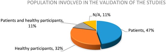 In the validation process (Figure 4), 47% of the studies involved patients (with a 21.66 median and a 19.77 standard deviation), 32% validated their proposal only with healthy participants, 11% made a correlational validation between patients and healthy participants, and the remaining 11% did not validate their proposal with a specific population, given that it had a technical focus (drift correction or systematic review of the literature, mainly).