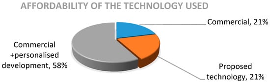 With regard to technology availability and affordability, 21% of the works included in this review used commercial products focused on physical rehabilitation. Another 21% proposed systems, referring to the development of technology in academic and/or investigative environments. Most of the studies (58%) were classified as “mixed”, given that the technology used involved a combination of commercial products and some personalized development (mainly videogames), as observed in Figure 5.