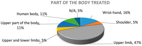 An additional aspect in the global analysis of the literature is that, although, within the search parameters, the upper limbs were included, it was identified that there was diversity regarding the part of the body being focused on in the works, as presented in Figure 6. It can be observed that 47% referred, in a general way, to the upper limb, 16% referred specifically to the wrist and the hand, 5% analyzed the range of movement of the shoulder joint, 5% included both upper limbs and lower limbs, 11% oriented the treatment toward the upper part of the body, another 11% focused on the movement of the whole human body, and the remaining 11% had a different focus; thus, they did not analyze any part of the human body.