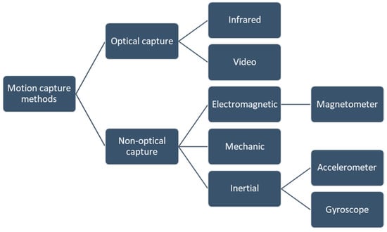 Motion capture (MOCAP) is the process of acquiring motion by combining software and hardware [] and is understood as a technique for recording motion and its corresponding transformation into a digital model. It is commonly used in areas such as entertainment, robotics, medicine, and physical rehabilitation, among others [,]. Specifically in the field of physical rehabilitation, it is used to identify the effectiveness of appropriate therapy plans [,], which when integrated with information and communication technologies in this field, provides therapeutic assistance to patients under the modality of telemedicine. Biomechanical motion capture systems can mainly be optical and non-optical, as shown in Figure 7.