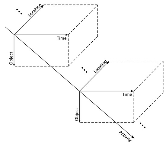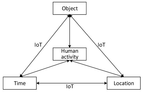 In this paper, we consider a human-centered smart community, which serves humans’ needs based on systematic information. For this purpose, a four-dimensional model is built, as depicted in Figure 1, which is based on object, time, location and human activity. The relationship between any two of them can be reflected by the data collected in the IoT network. For these four dimensions, location means a particular place or position in the community. Object refers to things and people that exist independently. Time is a series of consecutive discrete timestamps. Furthermore, human activities are various actions taken by people for commuting, living, reaction or necessity, such as running, walking, standing, talking, sitting, falling, fighting, abnormal activities, etc. With the help of IoT, data can be collected from wearable sensors, or remotely recorded from video, radar and other wireless sensing methods.