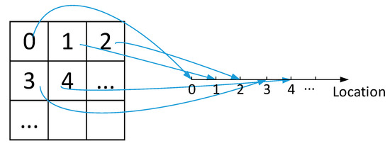 Finally, the indices of location dimension (mode 3) are the codes representing different geographic points/areas by applying a carefully designed coding scheme to transform the three-dimensional space into discrete sequences. A detailed discussion around the location coding scheme design could be found in [22] and the references therein, which is out of the scope of this paper. For the sake of demonstration, a simple location coding scheme is shown in Figure 4, where the whole monitored area is divided into K square subareas of equal size and numbered from the left-hand side to the right-hand side first and then from up to down.
