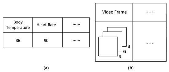 An element of a third-order tensor , can be seen as a state information matrix that stores the data collected from IoT sensors for object i at timestamp j and location k. The state information matrix should include the data collected and their types, which could be denoted by Unicode for instance. Two examples of element are shown in Figure 5 for demonstration purpose, where object i is a man wearing a smart watch that automatically connects to the IoT network in smart communities. The health-related data collected, such as body temperature and heart rate, are then transmitted to the gateway in the IoT network and saved to the corresponding state information matrix. Object is a surveillance camera installed, and thus the data collected are video frames, each of which is usually represented by a third-order tensor. It is can be seen that the data in a state information matrix is not limited to a scalar, but also could be a matrix or even a tensor.
