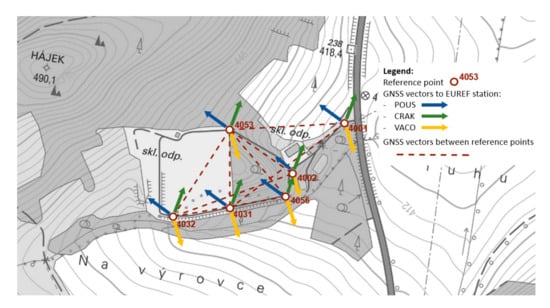 To determine the displacements of the landfill due to the highest accuracy of the data obtained, the hybrid network measurement method was used. It is a combination of the “classical” method and the GNSS method. The application of such a solution was determined by the lack of direct visibility between the points of the network. In the GNSS measurements, the static method was used due to the high accuracy of determining the coordinates of the receiver. This method is used in setting up and controlling geodetic networks and in geodynamic research. It allows us to achieve one-millimetre positioning accuracy [48].