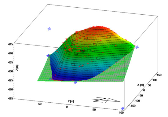 This equation approximates the height of landfill body surface with a high accuracy. C0–C45 coefficients were calculated by using the Gauss-Newton iteration method [49,50]. Subsequently, a mathematical model of the shape of the landfill body subsoil was created in which 52 points on the landfill body perimeter and six fixed points were used to calculate regression function coefficients shaped as in Equation (16), while very precisely modelling the subsoil height (Equation (18)).
