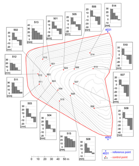 The subject of the study was monitoring of the landfill body stability in the given time period from 2013–2016. The selection of the measurement method was dependent on three basic factors: the speed of changes occurring on the investigated structure, the type of displacements determined, and the required measurement accuracy. The available methods include the “classical” approach based on surveying the network of geodetic benchmarks, the GNSS method, the laser scanning method, or the method of terrestrial radar interferometry. The GNSS method and the method of measuring angular-linear networks allow for periodic measurements and also measurement in real-time by using GNSS receivers and robotic total stations. These systems can work independently of each other or act as a single monitoring system. In the integrated monitoring system, we can also use object deformation sensors such as inclinometers, strain sensors, or fiber optic sensors. This type of monitoring system has been described by Liu et al. [45], which concerns the monitoring of underground structures in the reclamation area. The integrated monitoring system is used not only to determine displacements, but also informs us about the degree of security risk and helps us make early decisions to prevent a construction disaster. In the case of a landfill, a special factor influencing the increase in the risk of deformation are long-term heavy rains and storms, which affect its stability.