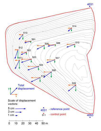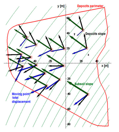 Figure 10 shows that total displacement is not parallel to the vectors of the landfill surface gradient—the landfill slope did not expose any failure signs. The displacement is not parallel to the vectors of subsoil gradient either. The landfill does not move. When viewed from above, only the horizontal shift is visible. This displacement is not parallel to the landfill slope. Vectors are heading the horizontal displacement of the landfill body and are not caused by any type of a landslide. Moreover, the size of the horizontal displacement is rather negligible when compared to the dimensions of the landfill body. Nevertheless, coefficients of the regression function, which explains the course of the vector field of the total displacement of moving points, could be calculated. If a regression function is selected, characterizing the vector fields of resulting displacement in the form of the equation below (Equation (20)).
