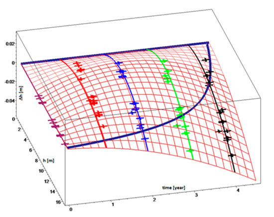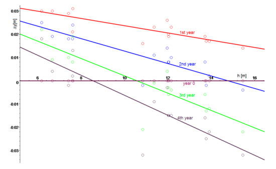 In order to establish the subsoil height, vertical displacement of the landfill body was studied where the thickness of the layer of landfilled waste (h) can be determined for any point on the landfill surface from the difference of functions (1)—denoting the landfill body height, and (2)—defining the subsoil height. Displacement is divided into a horizontal and vertical direction. Vertical displacement will be modelled by the function depending on the time and thickness of the waste layer. Measured displacements of fixed points were distributed to a horizontal displacement in the direction of the x,y plane and to vertical displacements in the direction of the z axis. Figure 8 shows a diagram plotted for the respective years, which shows the vertical displacement of individual points (Δy) in dependence on the layer thickness of stored waste (h).