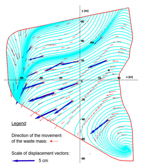 The method of least squares can be used to calculate coefficients Cx1…Cx10 and Cy1…Cy10, and then to plot trajectories of the displacement of landfilled waste by means of the Runge-Kutta method [51]. Vectors in Figure 11 show that the curves of waste displacement are in excellent agreement with the measured total displacement, which is illustrated using blue arrows. Practically, all curves corresponding to waste displacement are perpendicular to the active edge of the landfill onto which new waste is delivered. This indicates that the waste displacements are caused by the weight of the newly delivered waste and by pressures emerging during its compaction and transport. The whirl occurring in the right lower part of the landfill (Figure 11) on coordinates (45, 69) results from the non-existence of any adjacent moving point determining the vector field of total displacements.
