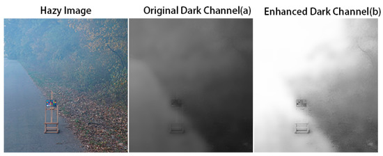 Equation (1) describes the calculation method of the original dark-channel method [3], where is the area centered on , is the color channel, and is the dark channel of image . As seen in Figure 2, the original dark channel can accurately display the haze area and concentration, but it is relatively gray; that is, the dark channel map has a lower value and cannot adequately represent the haze. The difference between the concentration and the reflection of different hazy areas may prevent dehazing from being targeted during the conversion process, thus enhancing the value of the dark-channel map.