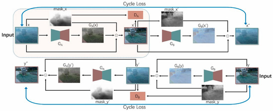 This network introduces cyclic consistency loss and perception loss. Similar to CycleGAN [8], images have a cyclic generation process in the network. The hazy image is input into the network using the proposed method, thereby generating the image through the first generator . Next, the attention mechanism is applied using Equation (2) to simultaneously calculate .