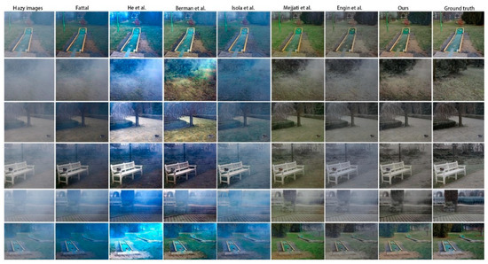 In this section, the proposed model is compared with various generative adversarial network models, including CycleDehaze [9], pix2pix [20], and the method of Mejjati et al. [26]. In addition, the proposed model is compared with some traditional methods, such as those presented by He et al. [3], Berman et al. [12], and Fattal [11]. We used the peak signal-to-noise ratio (PSNR), structural similarity (SSIM) [28], and CIEDE2000 [29] indicators to evaluate the models.
