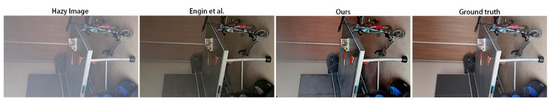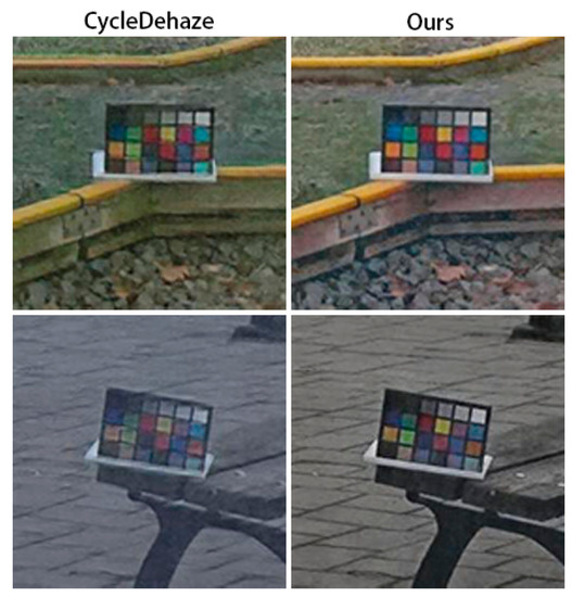 According to Table 1, it is obvious that the above-described indicators were superior when using the proposed method compared to CycleDehaze [9] in terms of detail and color, displaying higher values of PSNR and SSIM and a lower value of CIEDE2000 [28,29]. This shows that adding the attention mechanism improved the dehazing effect of the model and the quality of the generated images.