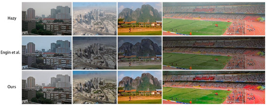 We compared the results obtained using the proposed method and others in the literature on the same dataset, where it was found that the proposed method’s sharpness, dehazing effect, and visual effect were better than those of other methods. When dehazing the misty and haze-free image areas, due to the introduction of the attention mechanism, the dark channels in the areas that were haze-free or that had little haze were closer to gray and black; thus, the value of each pixel in the attention map was biased toward 0. On the other hand, for the reserved area of the original image with no need for conversion, its weight was biased toward 1; thus, the characteristics of the original image could be better preserved. As shown in Figure 10, it can be clearly seen that our method could better retain the detail and color of the original image, thereby better restoring its original appearance.