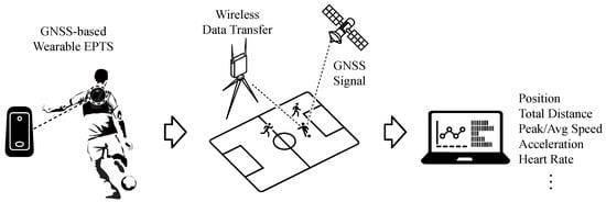 Since the German national football (The term football in this work refers to soccer or association football.) team dominated the World Cup in 2014 with various IT technologies [], the use of an electronic performance tracking system (EPTS) has been gaining huge popularity in the football industry and now has been standardized by FIFA to be used even at the international matches []. Basically, an EPTS device can be attached to the body of football players during the match (or training) time, sensing a number of data related to the athletic and strategic performances. As exemplified in Figure 1, the EPTS device may have a positioning system assisted by numerous calibration sensors [,,], collecting quantitative data such as total distance covered, peak/average speed, or other physiological data. These on-site measurements can be used for analyzing the physical workloads of each player, providing valuable insights to optimize the performance [,]. Considering the agile movements of football players, the accurate positioning solution is one of the key technologies, which can be realized by an optical-based tracking system (OTS), a local positioning system (LPS), or a global navigation satellite system (GNSS) []. While the OTS and LPS show a high sampling rate and measurement accuracy, both systems typically require high-cost calibration infrastructures installed around the stadium []. On the other hand, the GNSS-based EPTS device is usable in any open field, whereas the position and speed are directly measured using satellite signals, as shown in Figure 1. Due to the intrinsic errors of the GNSS module [,], the MEMS-based inertia measurement unit (IMU) module is in general integrated into the GNSS-based EPTS device to provide more accurate information [,,].
