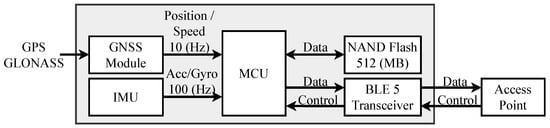 Figure 2 illustrates the block diagram of the proposed wearable EPTS device prototype that includes a GNSS module [], an IMU module [], a micro-controller unit (MCU) [], NAND flash memory, and wireless communication modules using BLE5protocols, which is generally adapted by commercial EPTS devices [,,]. For the baseline EPTS operation, the accessing frequency of GNSS module was set to 10Hz, measuring the position, as well as the speed of players every 100 ms by receiving the global positioning system (GPS) signal and the global navigation satellite system (GLONASS) signal concurrently. The nine axis MEMS-based IMU device consists of an accelerometer, a gyroscope, and a magnetometer, where the first two internal sensors generate the measurement data every 10 ms. The magnetometer in the IMU module is reserved for the future extension, and thus, we disabled the corresponding parts for low-energy operations. From the IMU measurements, the firmware program basically computes the total amount of acceleration by performing the attitude estimation filter []. Then, the linear Kalman filter is applied to compensate for the intrinsic speed errors by combining the measured speed from the GNSS unit with the estimated net acceleration []. Note that the sampling time of sensor measurements are synchronized at the firmware level to provide accurate filtering operations. In addition to the sensor-related EPTS operations, in the proposed EPTS device, the BLE5-based radio transceiver was adopted to realize the stable real-time tracking and the efficient remote control of the EPTS device with low energy consumption. When the EPTS cannot use wireless communication, the sensing data are temporally stored in the NAND flash memory of 512 MB, which is enough to keep all the data for the match time. To manage the overall EPTS operations, we also implemented the control firmware on the ARM Cortex-M4 MCU, which disables the inactivated components to reduce the power consumption in standby mode.