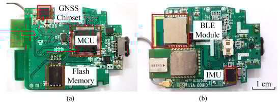 Based on the system architecture shown in Figure 2, we realized a prototype EPTS device having a form factor of , where the top and bottom views of the prototype are shown in Figure 3. As discussed in the prior subsection, the basic EPTS operation sets the GNSS and the IMU sensing rates to be 10 Hz and 100 Hz, respectively, whereas the embedded MCU operates at a speed of 80 MHz for performing the overall firmware programs managing sensors and data flows. Compared to our original EPTS solution described in [], note that the proposed version reduces the device size by 40% through the compact design of the circuit board while providing measurements at the same sensing rates. The BLE5 unit continuously transfers the position, speed, and IMU measurements at a speed of 125 Kbps. Using the coin-sized 550 mAh battery, the baseline operation on the prototype EPTS device lasts about five hours, which is comparable to the commercialized products having similar form factors [,,].