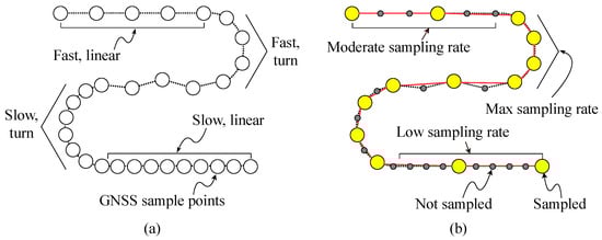 (a) A trajectory recovered by the baseline sampling associated with the fully-activated GNSS module and (b) a trajectory recovered by the activity-aware sampling with the reduced number of GNSS accesses.
