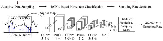 For the straight-forward classification, similar to the prior work from [], we may directly use the speed measurements from the GNSS unit to set the intuitive thresholds to classify some human activities. For example, the athlete’s movement can be determined based on the fixed speed criteria defined in related papers [,], and then, the GNSS sampling rate for each activity can be adjusted to eliminate over-sampling data, as described in Table 2. However, the speed value can only provide hints for categorizing the linear movements, and this approach cannot capture the rotation-related motions. Therefore, the energy-reduction from the straight-forward recognition is marginal due to the limited capability for categorizing the movement types of football players. In order to provide precise control of sensor modules, by using additional sensing signals from the IMU module, we develop the DCNN-based recognition of football activities, further reducing the energy consumption of the EPTS device.