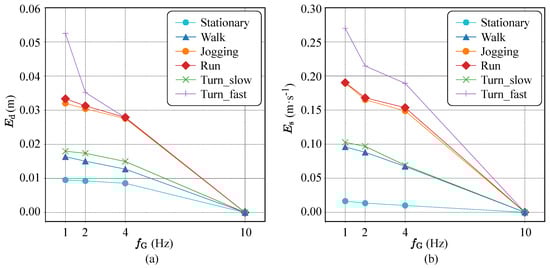 In order to show the quantitative analysis of the proposed DCNN-based EPTS operation, for different sampling rates of the GNSS module, the amount of distance and speed errors is detailed in Figure 9a and Figure 9b, respectively. Note that the optimal  can be different for each football activity, and the proposed sensor control strategy shown in Table 6 successfully selects the valid option, reducing the measurement errors for the standardized trajectory test. For example, the proposed approach automatically sets  when the CNN operation detects the turning_slow activity, which consumes the minimum energy without increasing the distance errors, as shown in Figure 10. On the other hand, the straight-forward method reduces the sampling rates depending only on speed, which requires more samples for turning movements as shown in Figure 8a. Moreover, the proposed DCNN-based control method allows turning off the IMU operations for a while, further reducing the energy consumption of the EPTS device.
