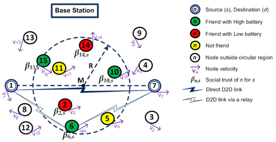 Figure 1 illustrates the search location of a socially trusted relay device that improves the D2D communication between mobile devices. The circles with n inside them represent devices in the network, where n represents the device number. An arrow in a device represents the direction of mobility and underneath represents its velocity. The double-lined circles are source device s and destination device d. The dashed circle with radius R represents a relay selection region which is centered at the midpoint M of the distance between s and d. The circles (with white background) are devices outside relay selection region. The circles (with green background) are friends of source with high battery power levels within the circular region. Similarly, the circles (with red background) are friends of source with low battery power levels. The circles (with yellow background) are devices which are not friends of source. The social trust value that a device n has for the source s is represented by .