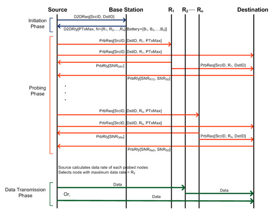 where, t is the time slot duration, is the probe duration and p is the number of probes [7,8,12]. The throughput decreases with the increase in duration and number of probes. However, to select a relay transmitting with high power, multiple devices are required to be probed.