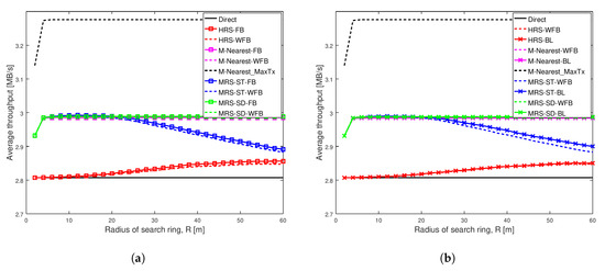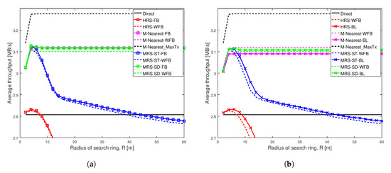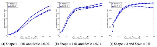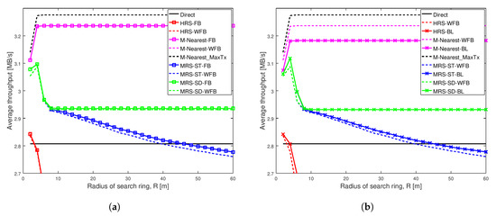 Figure 8b shows that the transmission power of all the schemes increases with the increase in search radius. The transmission power of MRS-ST-BL gradually increases and becomes higher than that of MRS-ST-WFB, which can be observed when the search radius is greater than 20 m. However, for larger search radius, the difference in transmission power of MRS-ST-BL and MRS-ST-WFB becomes small.