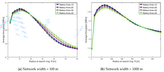 This section presents the impact of change in battery threshold () on average throughput of the proposed scheme MRS-ST-BL. Figure 9 illustrates the change in average throughput of MRS-ST-BL as the search radius increases for network widths of 100 m and 1000 m. The key observation from the figure is that the maximum throughput attained by our proposed scheme MRS-ST-BL reduces with the increase in battery threshold.