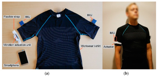(a) The Smart Workwear System, here, (b) fitted on the human body with two inertial measurement units (IMUs) for recordings of work postures of the upper arms and to provide haptic feedback on the dominant arm. The hardware components in this module example include a customized workwear T-shirt, two IMUs, one vibration actuation unit, and a semi-elastic textile strap, and one smartphone.