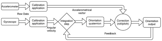 Simplification of the filter. Orientation initially determined by an integration of the angular velocity extracted from the gyroscope after calibration. Orientation is corrected (roll and pitch) with the acceleration vector.