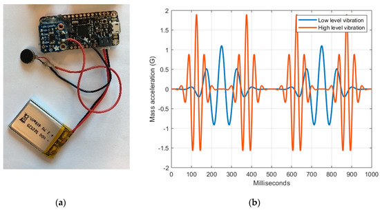 (a) Adafruit Feather 32u4 Bluefruit development board connected to an eccentric rotating mass vibration motor and powered by a battery; and (b) a depiction of the acceleration of the eccentric rotating mass of the vibrational motor. The first level (in blue) consists of two lower-intensity oscillations, while the second level (in red) consists of four higher-intensity oscillations, for 1000 milliseconds. Users perceived the first level as less intense than the second.