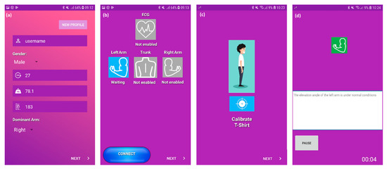 Screenshots of the Android smartphone application ‘ErgoRiskLogger’: (a) splash screen to enter wearer identification with a unique identifier and biometrical information (sex, age, weight, height, and selection of the dominant arm); (b) user interface screen for the selection of sensors, which is limited to the dominant arm of the user (wearer) for this study; (c) IMU and haptic feedback calibration screen, in order to establish a zero elevation position and test vibrational intensity; and (d) screen with real-time feedback with additional text report and color-coded icons.