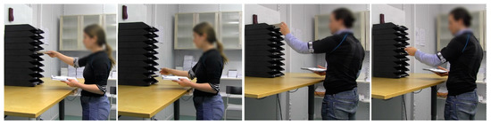 The task comprised the sorting of 30 randomly ordered letters (marked 0–9) in their corresponding letter tray (marked 0–9) under two experimental conditions: (A) an intervention condition with predetermined positions of the letter tray stack and where the participants received verbal ergonomics instructions to reduce adverse postures (Ergo-Instr. 1 and 2) or verbal instructions in combination with haptic feedback (Haptic-FB 1 and 2), and (B) a workstation design condition (WS-design) where the subjects were instructed to arrange the position of the ten letter trays to minimize their upper-arm elevation receiving verbal ergonomics instructions (WS-Design 1 and 2) or verbal ergonomics instructions in combination with haptic feedback (WS-Design 3). Each participant performed a practice session before the study to become familiar with the mail sorting task, subjective ratings of perceived discomfort/pain, using the Borg CR10 scale [79] and a body map [80], and the general work instruction that was based on previous psychophysical studies to determine acceptable workloads [81]. No time restrictions were given; instead, the subjects were instructed to imagine the mail sorting task as being part of their normal job and performing the task at a pace which they could sustain for two hours per workday for five days per week, and that the task was not a competition (i.e., the general work instruction).