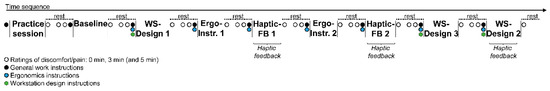 Time sequence of the test comprising the practice session, the baseline, the intervention condition (Ergo-Instr. 1 and 2, and Haptic-FB 1 and 2), and the workstation redesign condition (WS-Design 1–3).