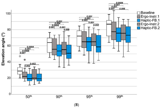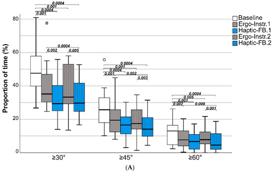 (A) Accumulated time of the dominant upper-arm elevations ≥30°, ≥45°, and ≥60°, and (B) the 50th, 90th, 95th, and 99th percentile dominant upper-arm elevation angles of the baseline and the intervention scenarios where the participants received verbal ergonomics instructions (Ergo-Instr.) or verbal ergonomics instructions in combination with haptic feedback (Haptic-FB). The boxplots show the median, the interquartile range, and the max and min values. Statistically significant (p < 0.01, Wilcoxon signed-rank test) differences between the scenarios are displayed with their corresponding p-values.