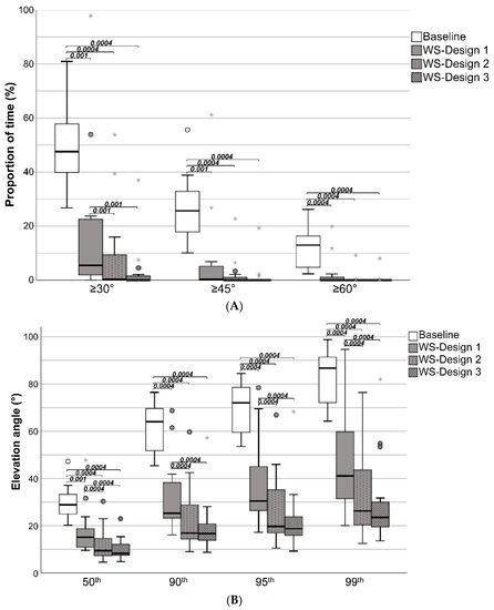 (A) Accumulated time of the dominant upper-arm elevations ≥30°, ≥45°, and ≥60°, and (B) the 50th, 90th, 95th, and 99th percentiles of dominant upper-arm elevation angle in the baseline and the workstation design (WS-Design) scenario. The boxplots show the median, the interquartile range, max and min values. Statistically significant (p < 0.01, Wilcoxon signed-rank test) differences between the scenarios are displayed with their corresponding p-values.