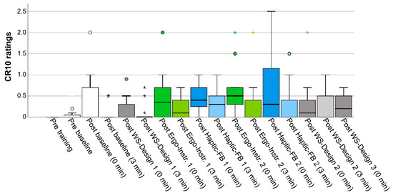 As shown by the descriptive data (Figure 11), low CR10-ratings of discomfort/pain were reported for all sessions. The mean CR10-ratings for all sessions immediately after finishing the task were 0.41 (SD 0.28), and 0.21 (SD 0.35) after 3 minutes’ rest, where a value of 0.5 corresponds to an extremely weak (just noticeable) discomfort/pain. The mean CR10-ratings were <0.7 for each session end (0 min), and <0.5 after 3 minutes’ rest. A few participants rated the discomfort/pain as weak/light (2.0) or slightly more (2.5) following the end of the sessions. These few ratings were generally reduced to around 1.0 (very weak discomfort/pain) after a rest period of 3 min. Twelve of the participants did not at any point state their discomfort/pain to be more than very weak, while four participants reported their discomfort/pain to be more than very weak at least once during the entire trial, and located in the following body regions: right/left shoulder (N = 2), right/left elbow (N = 1), and upper/lower back (N = 2). None of the participants, however, reported discomfort/pain to be more than very weak immediately following the last test session (WS-Design 3). It should be noted that, when asked to rate the perceived discomfort/pain, the participants tended to base their discomfort/pain-ratings on perceived discomfort rather than perceived pain.