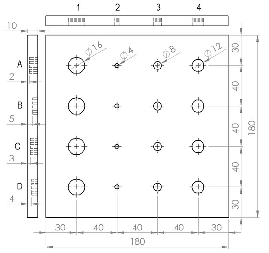 A sample made of austenitic stainless steel (SUS 316) with the flat-bottomed holes (FBH) was considered to simulate wall thinning defect. Figure 3 depicts the schematic illustration of the sample, along with the geometry and location of artificial FBH. It is a square-shaped plate with dimensions 180 × 180 mm and thickness of 10 mm. Artificial FBHs of different sizes at varying depth levels were milled at the rear surface to evaluate the detection capability of the proposed technique. The FBHs in each column represents the defects with a constant diameter, but of different depth from uppermost to lowermost row. Referring to Figure 3, ‘A’, ‘B’, ‘C’, and ‘D’ represent defects along the horizontal rows and have different defect diameters. Similarly, ‘1’, ‘2’, ‘3’, and ‘4’ represent the defect size along with vertical columns and have different depths. All the sixteen defects are indexed with a distinctive ‘Defect ID’ using these representations. For instance, defect ID of defect in the first row and the first column is ‘A1’ which has a diameter of 16 mm and depth of 2 mm; defect ID of defect in second row and second column is ‘B2’ which has a diameter of 4 mm and depth 5 mm; defect ID of defect in third row and third column is given as ‘C3’ which has a diameter of 8 mm and depth of 3 mm; defect ID of defect in the last row and the last column is given as ‘D4’ which has a diameter of 12 mm and depth of 4 mm, and so on. The front side of the sample was painted black using KRYLON flat paint having an emissivity of 0.95 to create a uniform emissive surface. Figure 4 depicts the photographs of the sample considered for the study.