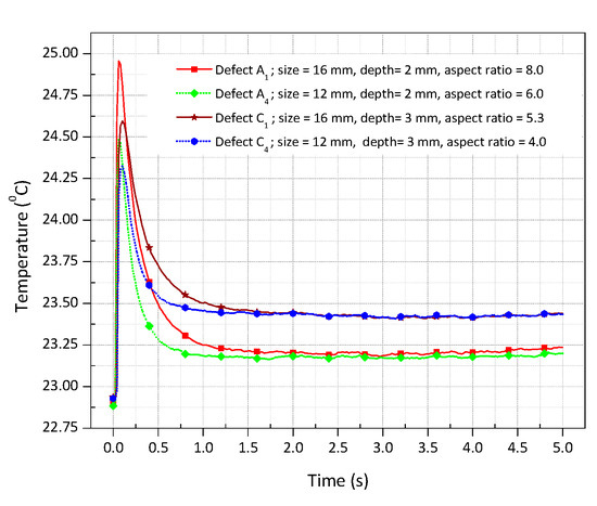 Figure 5a depicts the thermal image at time 0 s recorded before the application of a pulse heating. Figure 5b depicts the thermal image at time 0.1 s recorded after the deposition of heat flux where the detected defects exhibit the higher signal-to-background contrast without performing any data processing techniques. Figure 5c depicts the thermal image which is a result of subtracting Figure 5a from Figure 5b. The results showed that the shallower defects with larger size were detected clearly, whereas the deeper defects with smaller size were detected faintly. To investigate the effects of defect geometry on the applied heat flux, the thermal response of the defects with different aspect ratio (ratio of diameter to depth) was analyzed. Defects A1, A4, C1, and C4 with an aspect ratio of 8.0, 6.0, 5.3, and 4.0, respectively, were chosen for the investigation. The ROI of 4 × 4 pixels at the centre of each defect was considered, and the average mean temperature was measured. Figure 6 depicts the thermal response of the selected defects concerning the time of 5 s. It was observed that the temperature attained by the sample was faster than its decay because of short impulse time. As time passed, the temperature on the surface tends to reach equilibrium. It was worth noting that the shallower defect A1 with a high aspect ratio causes significant temperature difference when compared with other defects with a smaller aspect ratio. The variation in the surface temperature distribution was enough to distinguish the defects. However, the processing of thermal images was done to reduce noise and enhance the defect detectability. The algorithms stated in Section 3 were compiled by using MATLAB® R2019a.