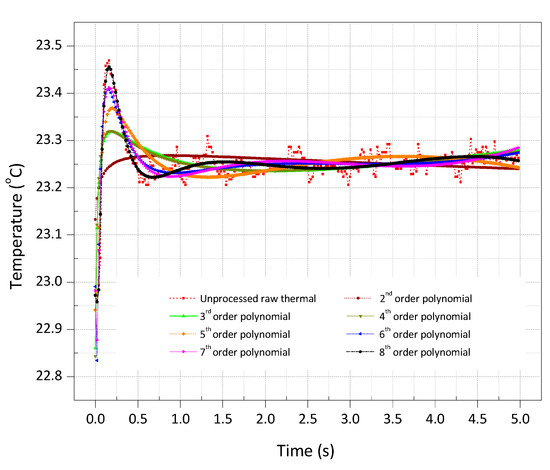 where T is the increment in temperature as a function of time and , ,…, are the polynomial coefficients. In NDT, fifth or sixth order polynomial was found effective in temporal noise reduction and the optimum degree of the polynomial in use was found up to ninth order. The first log-time derivative and the second derivative of the polynomial enhanced the defect detectability and SNR [68,69].